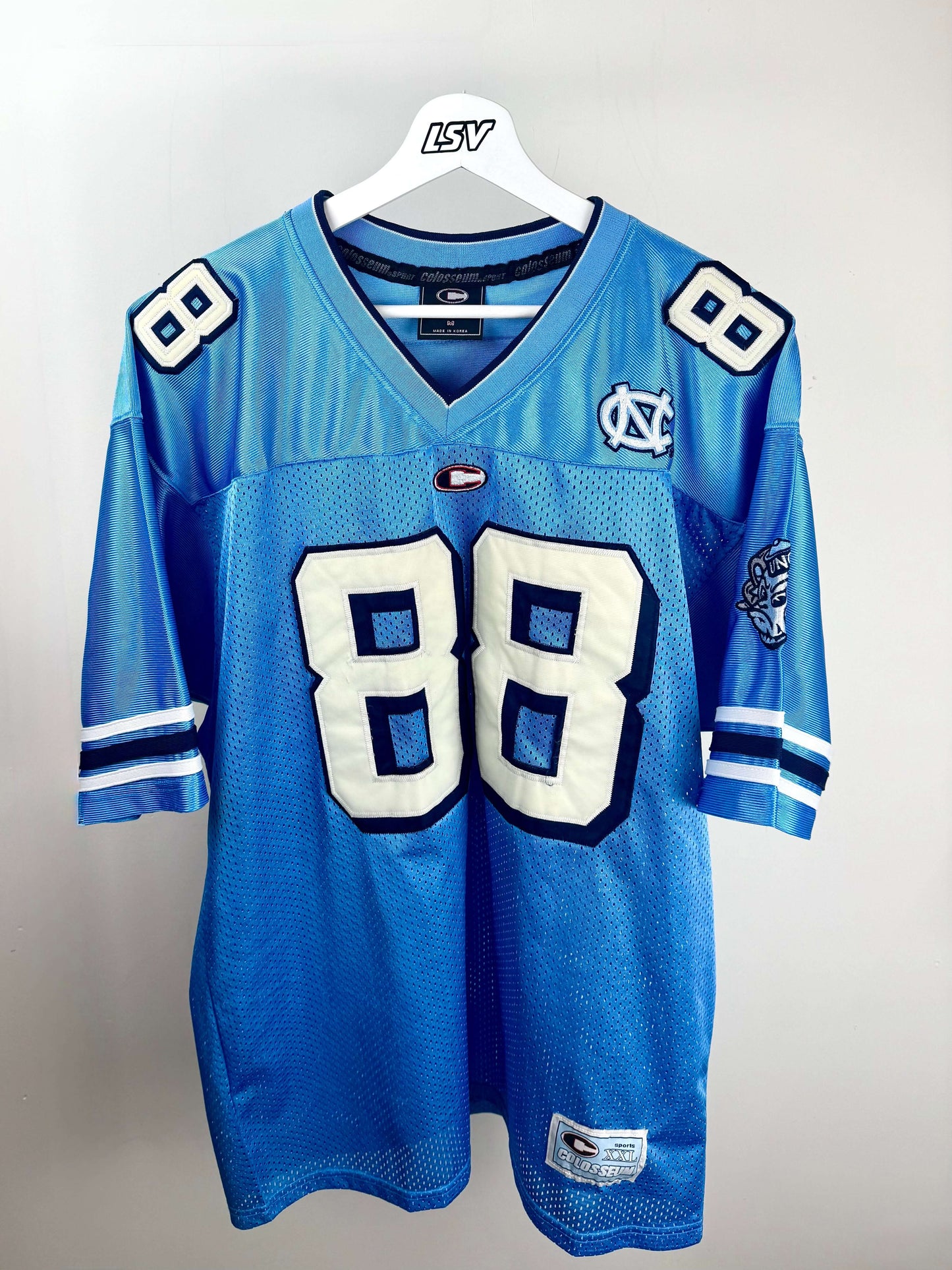 Maillot North Carolina Tar Heels bleu clair avec le numéro 88, taille M sur l'étiquette, correspond à une taille (les maillots sont toujours longs et oversize !). Fabriqué en tissu mesh brillant. Des détails blancs et bleu foncé le complètent. En très bon état.